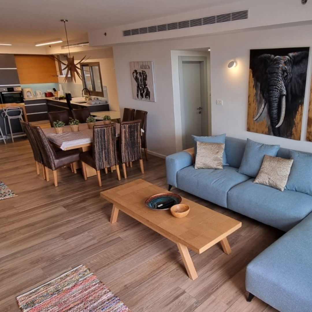 A ten-minute walk from Poleg's sandy beach, this four-bedroom luxurious, kosher apartment is tastefully furnished and aptly fitted with all the essential amenities for your convenience. Fully air-conditioned throughout, this is a great place to stay any time of the year.