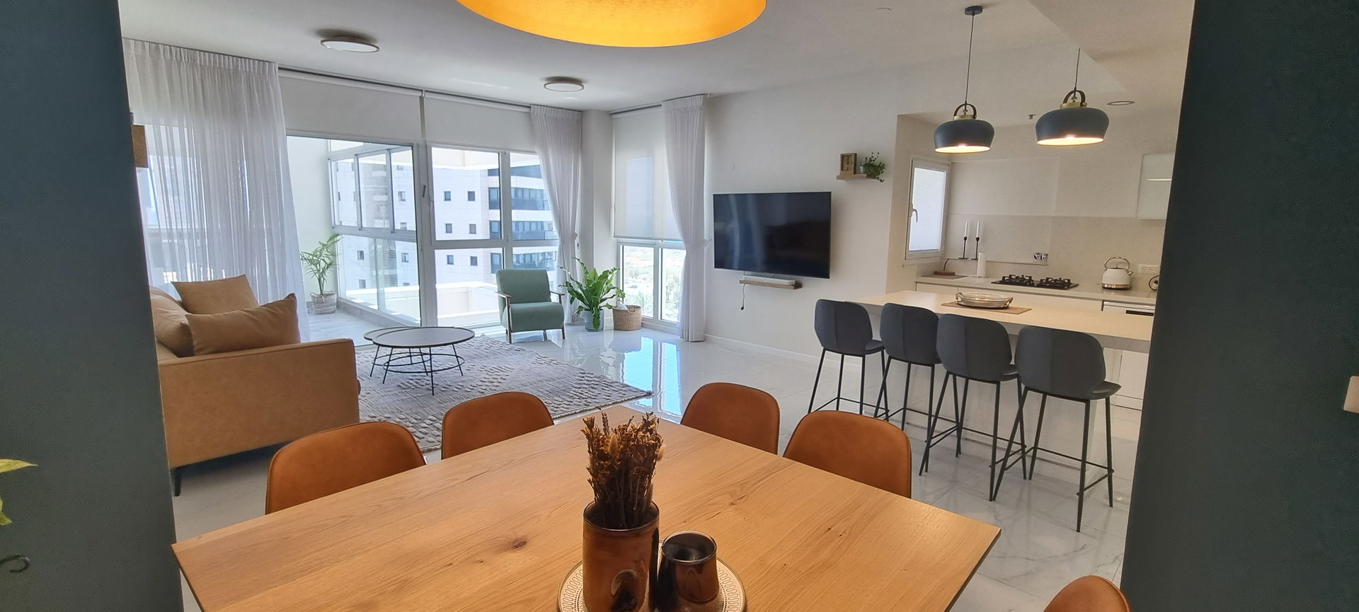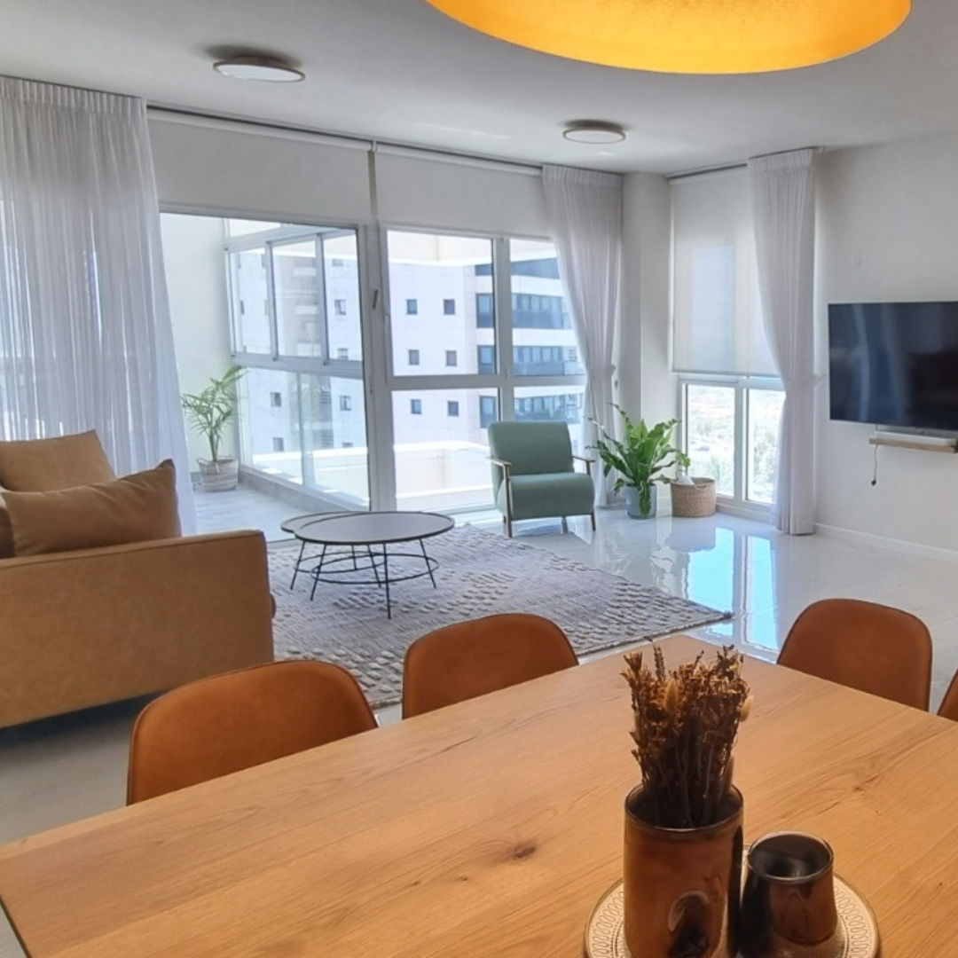 Experience Netanya's Upscale Ir Yamim Neighborhood at This Modern, Stylish, Fully Air-Conditioned, Light-Flooded, and Tastefully Decorated 4 Bedroom Vacation Rental Apartment with Balcony Overlooking the Mediterranean Sea and the Iris Nature Reserve.